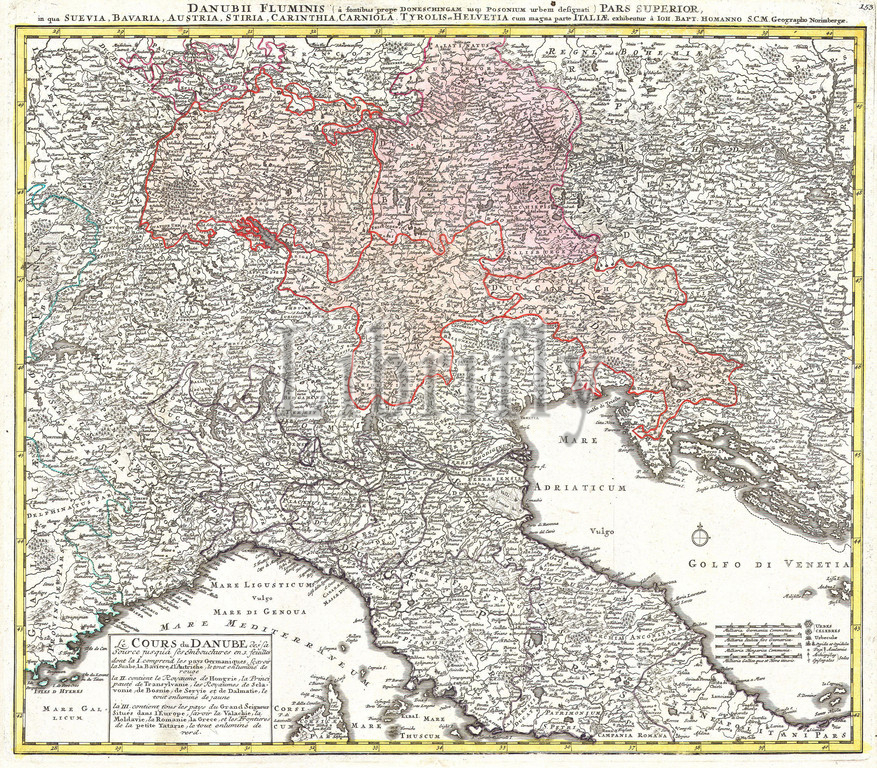 1720, Homann Map of Northern Italy Danubii Fluminis, topography, cartography, geography, land, illustration, geographic, travel, topo, chart, grid, latitude, longitude, geometric, atlas, map, vintage, ancient, history, world, paper, old, retro, earth, atlas, art, historical, decorative, navigation, aged, historic, journey, discovery, exploration, geographical, Mappa mundi, space, region, old map, antique map, rare old maps, old antique plan, ols antique map, old antique view