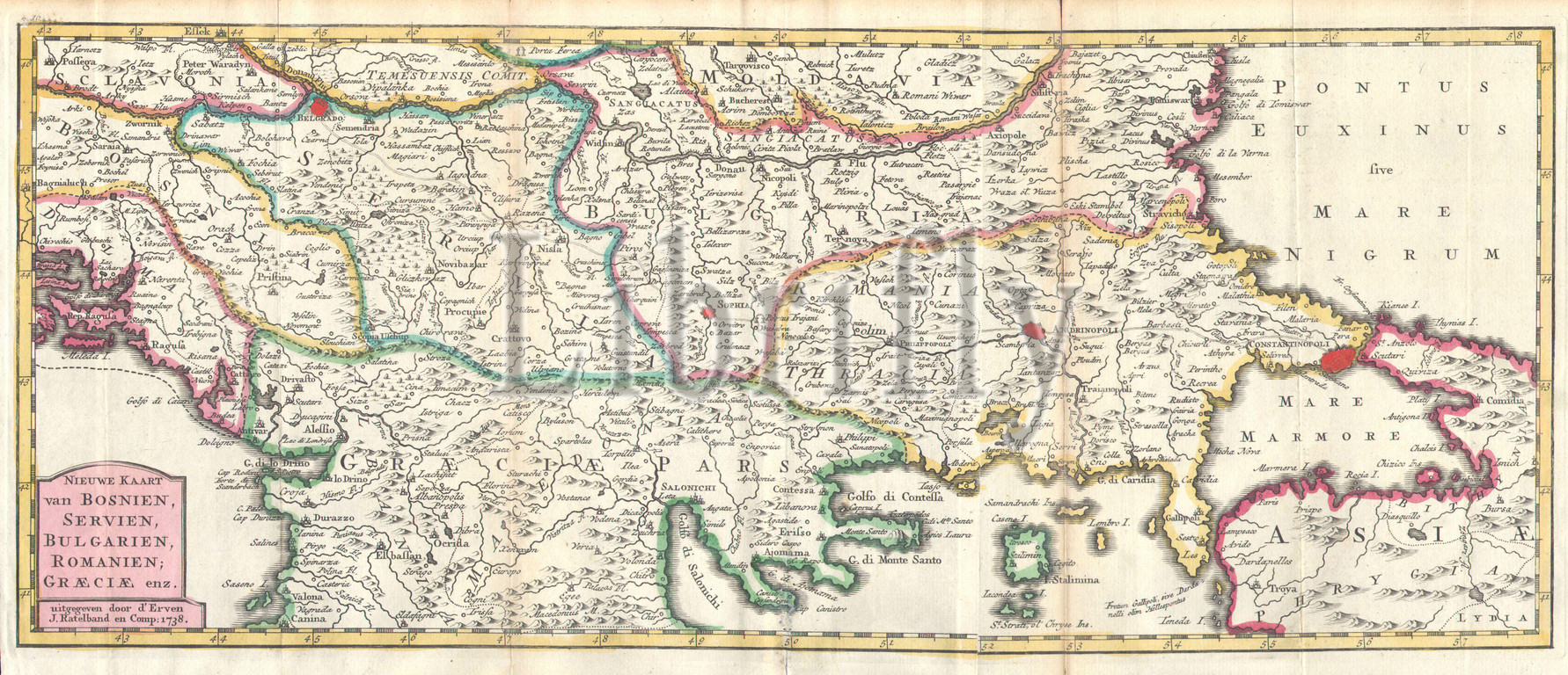 1738, Ratelband Map of the Balkans, Bosnia, Serbia, Bulgaria, Rumania, topography, cartography, geography, land, illustration, geographic, travel, topo, chart, grid, latitude, longitude, geometric, atlas, map, vintage, ancient, history, world, paper, old, retro, earth, atlas, art, historical, decorative, navigation, aged, historic, journey, discovery, exploration, geographical, Mappa mundi, space, region, old map, antique map, rare old maps, old antique plan, ols antique map, old antique view