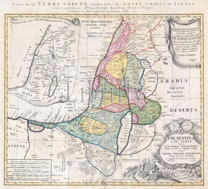 1750, Homann Heirs Map of Israel, Palestine, Holy Land, 12 Tribes