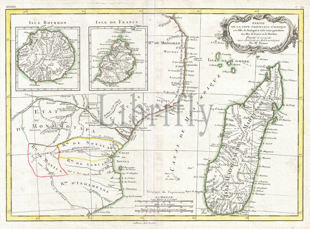 1770, Bonne Map of East Africa, Madagascar, Isle Bourbon and Mauritius, Mozambique, Rigobert Bonne 1727 – 1794, one of the most important cartographers of the late 18th century