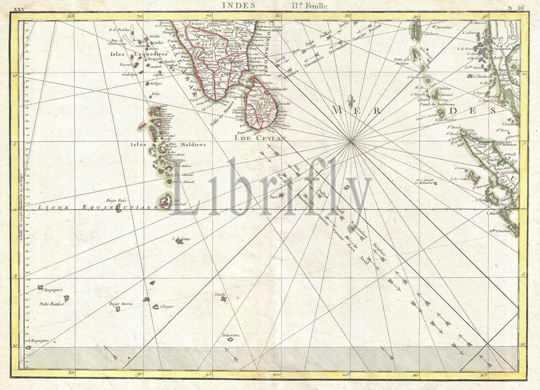 1770, Bonne Map of Southern India, Sri Lanka, Ceylon, the Maldives, and the Indian Ocean, Rigobert Bonne 1727 – 1794, one of the most important cartographers of the late 18th century