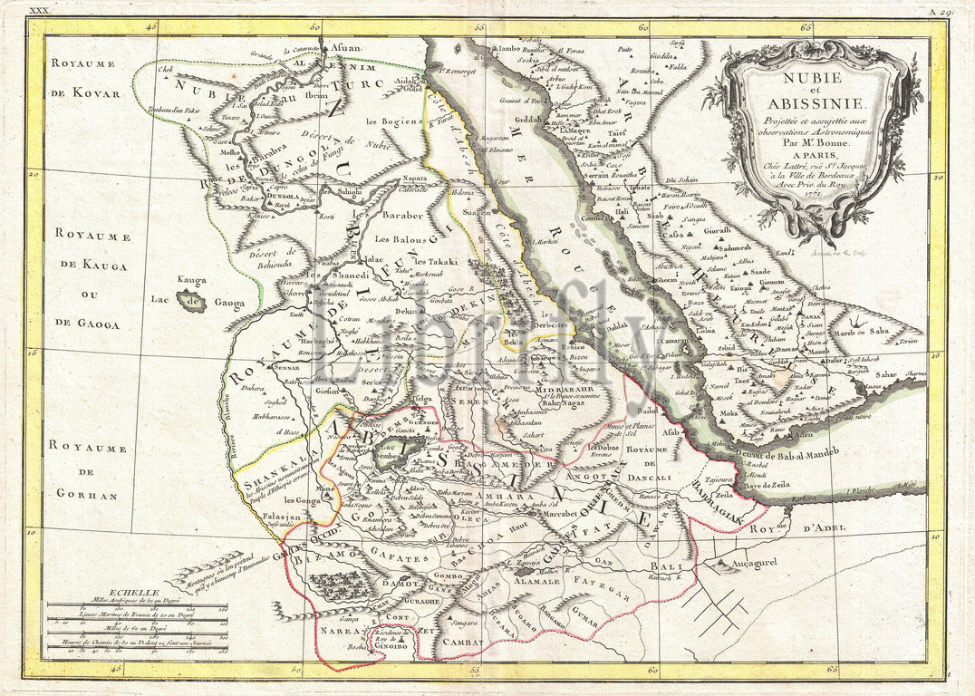 1771, Bonne Map of Abyssinia, Ethiopia, Sudan and the Red Sea, Rigobert Bonne 1727 – 1794, one of the most important cartographers of the late 18th century, topography, cartography, geography, land, illustration, geographic, travel, topo, chart, grid, latitude, longitude, geometric, atlas, map, vintage, ancient, history, world, paper, old, retro, earth, atlas, art, historical, decorative, navigation, aged, historic, journey, discovery, exploration, geographical, Mappa mundi, space, region, old map, antique map, rare old maps, old antique plan, ols antique map, old antique view