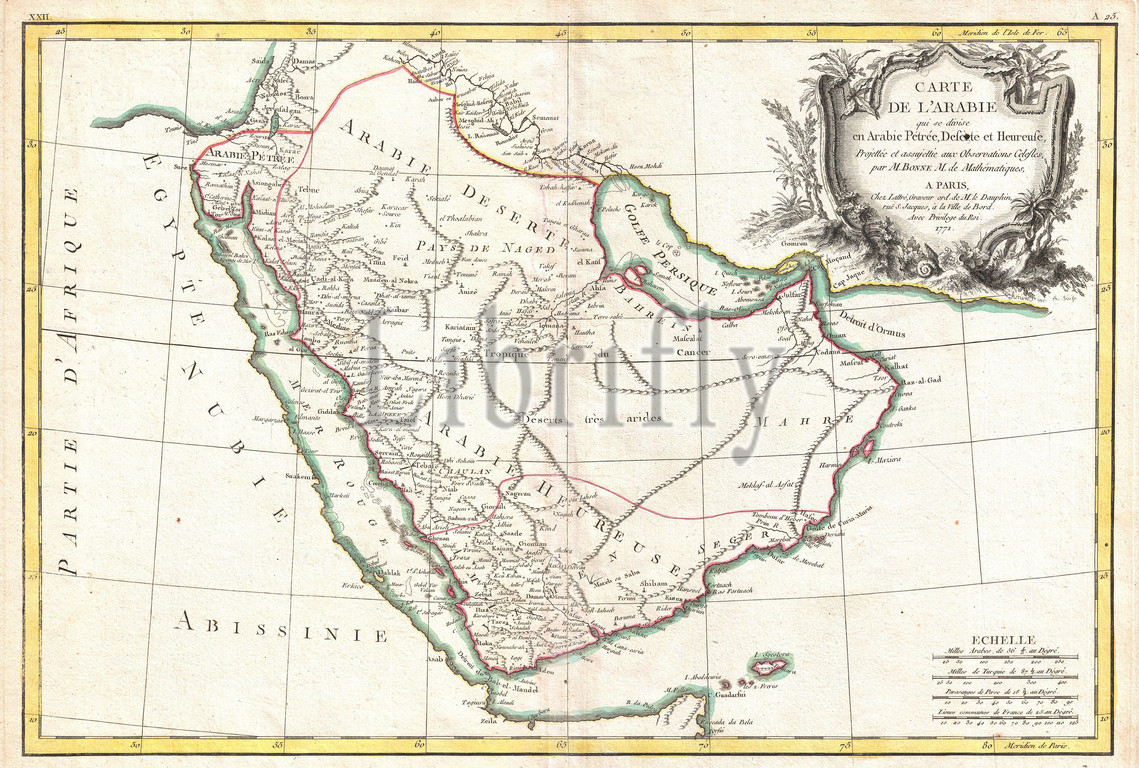 1771, Bonne Map of Arabia, Rigobert Bonne 1727 – 1794, one of the most important cartographers of the late 18th century, topography, cartography, geography, land, illustration, geographic, travel, topo, chart, grid, latitude, longitude, geometric, atlas, map, vintage, ancient, history, world, paper, old, retro, earth, atlas, art, historical, decorative, navigation, aged, historic, journey, discovery, exploration, geographical, Mappa mundi, space, region, old map, antique map, rare old maps, old antique plan, ols antique map, old antique view
