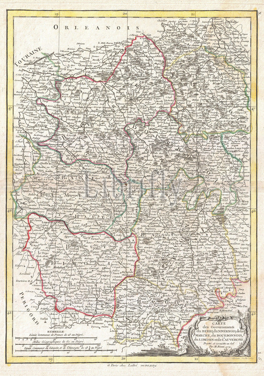 1771, Bonne Map of the Auvergne, Limosin, Bourbonnais, and Berri, France, Rigobert Bonne 1727 – 1794, one of the most important cartographers of the late 18th century