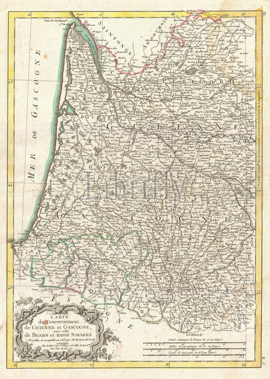 1771, Bonne Map of Guyenne and Gascony, France, Rigobert Bonne 1727 – 1794, one of the most important cartographers of the late 18th century