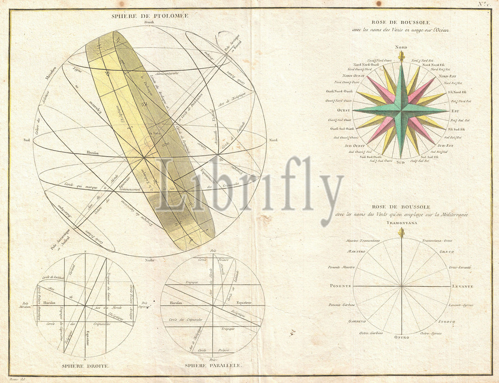 1775, Bonne Map or Chart of the Spheres and Compass Rose, Rigobert Bonne 1727 – 1794, one of the most important cartographers of the late 18th century, topography, cartography, geography, land, illustration, geographic, travel, topo, chart, grid, latitude, longitude, geometric, atlas, map, vintage, ancient, history, world, paper, old, retro, earth, atlas, art, historical, decorative, navigation, aged, historic, journey, discovery, exploration, geographical, Mappa mundi, space, region, old map, antique map, rare old maps, old antique plan, ols antique map, old antique view