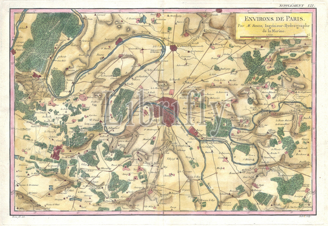1780, Bonne Map of the Environs of Paris, France, Rigobert Bonne 1727 – 1794, one of the most important cartographers of the late 18th century