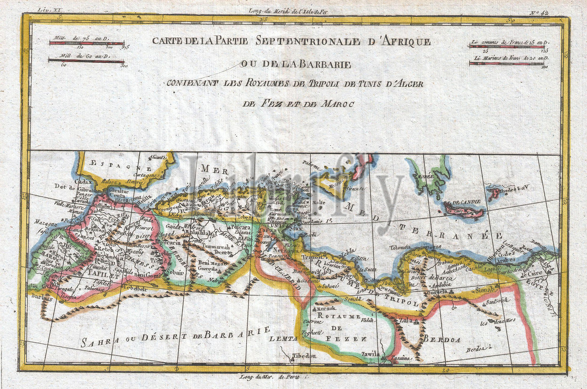 1780, Raynal and Bonne Map of the Barbary Coast of Northern Africa, Rigobert Bonne 1727 – 1794, one of the most important cartographers of the late 18th century