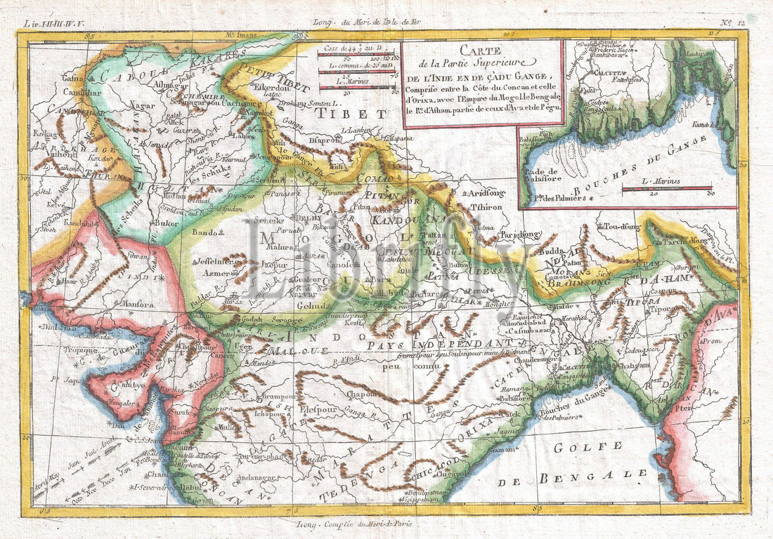 1780, Raynal and Bonne Map of Northern India, Rigobert Bonne 1727 – 1794, one of the most important cartographers of the late 18th century, topography, cartography, geography, land, illustration, geographic, travel, topo, chart, grid, latitude, longitude, geometric, atlas, map, vintage, ancient, history, world, paper, old, retro, earth, atlas, art, historical, decorative, navigation, aged, historic, journey, discovery, exploration, geographical, Mappa mundi, space, region, old map, antique map, rare old maps, old antique plan, ols antique map, old antique view