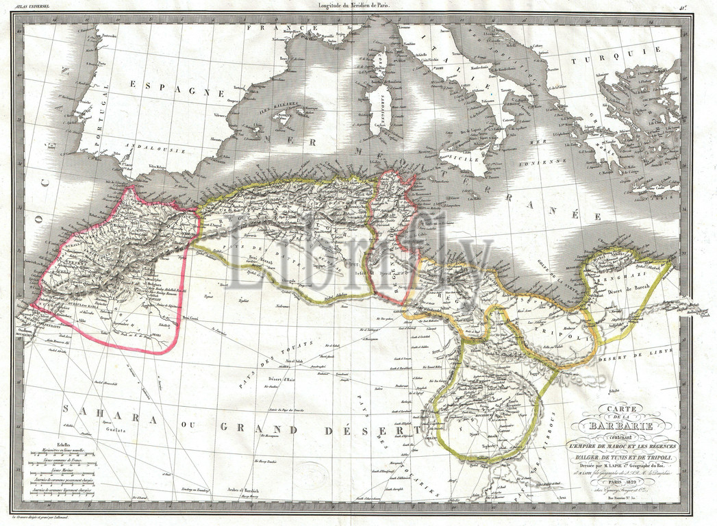 1829, Lapie Map of the Eastern Mediterranean, Morocco, and the Barbary Coast, topography, cartography, geography, land, illustration, geographic, travel, topo, chart, grid, latitude, longitude, geometric, atlas, map, vintage, ancient, history, world, paper, old, retro, earth, atlas, art, historical, decorative, navigation, aged, historic, journey, discovery, exploration, geographical, Mappa mundi, space, region, old map, antique map, rare old maps, old antique plan, ols antique map, old antique view