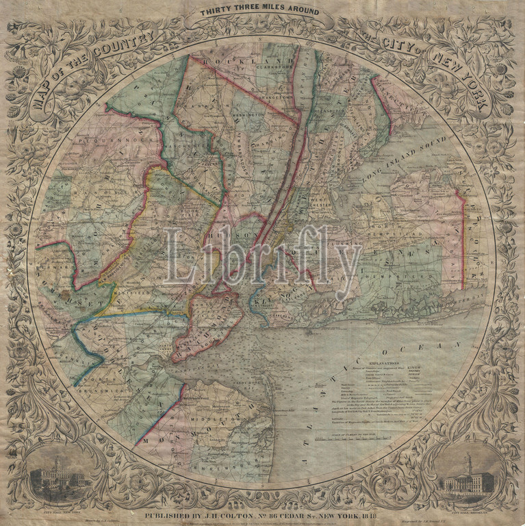 1848, Colton Map of New York City and Vicinity, 33 Miles Around, topography, cartography, geography, land, illustration, geographic, travel, topo, chart, grid, latitude, longitude, geometric, atlas, map, vintage, ancient, history, world, paper, old, retro, earth, atlas, art, historical, decorative, navigation, aged, historic, journey, discovery, exploration, geographical, Mappa mundi, space, region, old map, antique map, rare old maps, old antique plan, ols antique map, old antique view