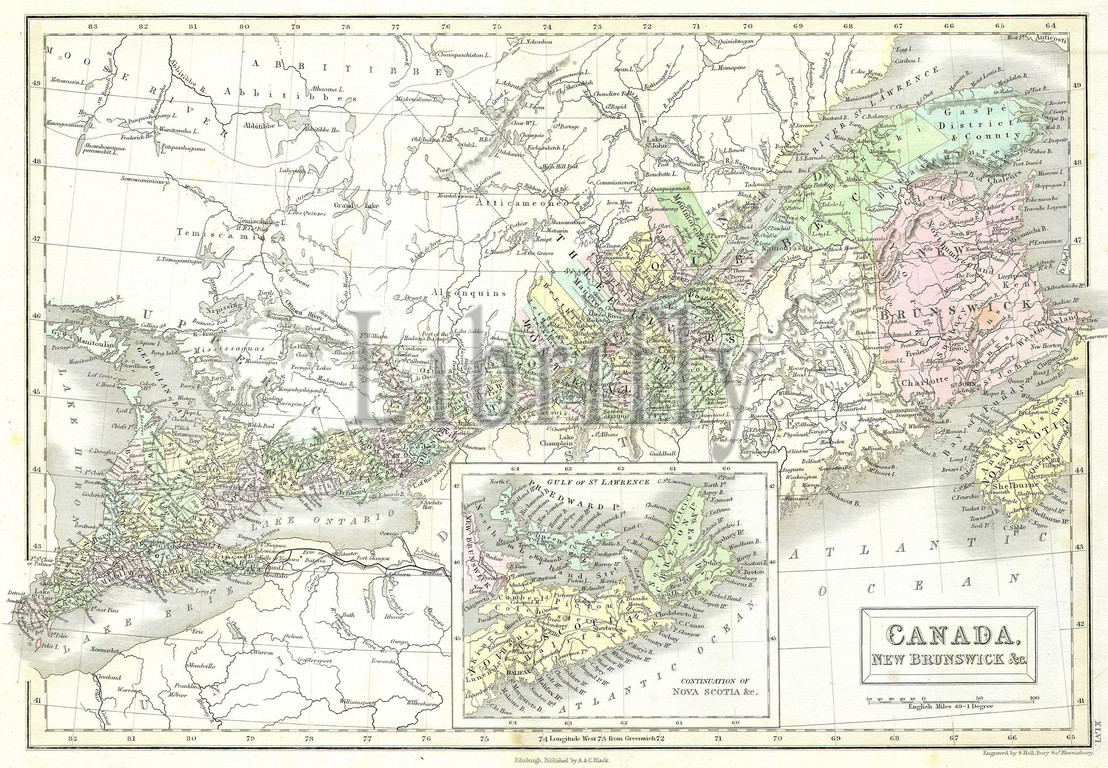 1851, Black Map of Eastern Canada, Ontario, New Brunswick
