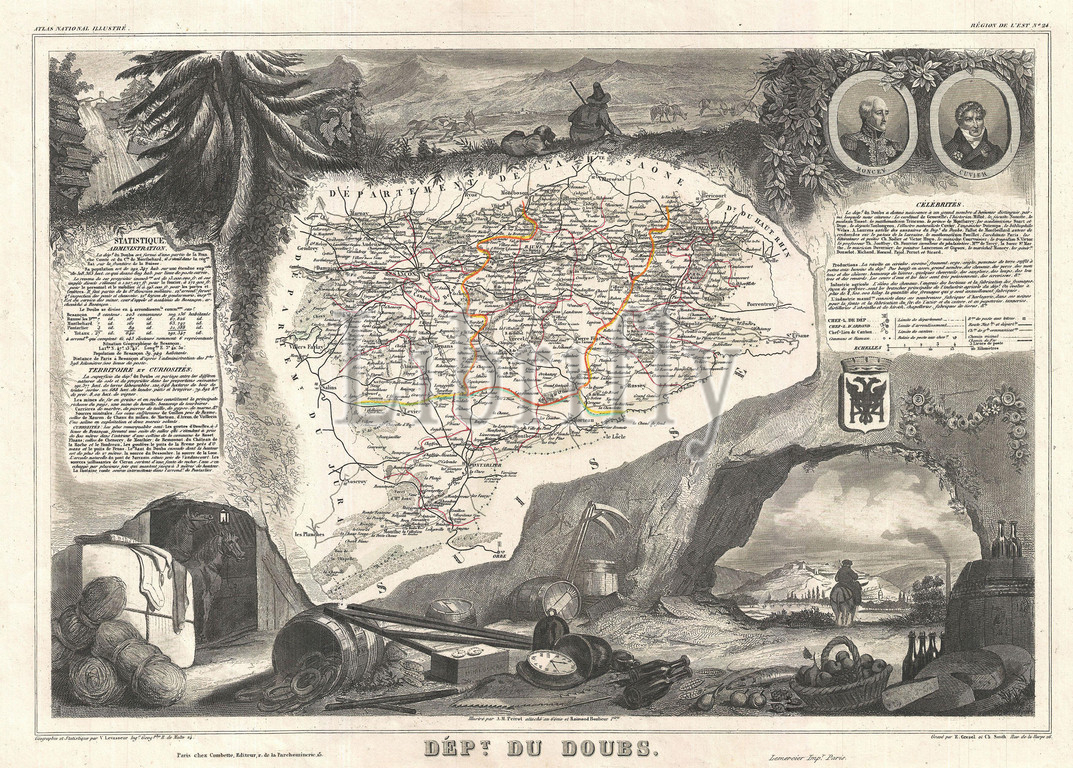 1852, Levasseur Map of the Department du Doubs, France