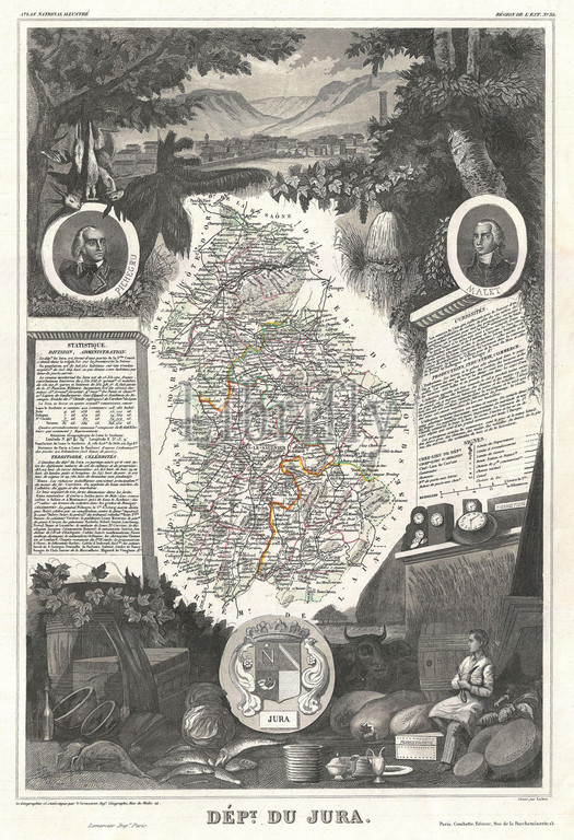 1852, Levasseur Map of the Department du Jura, France, France