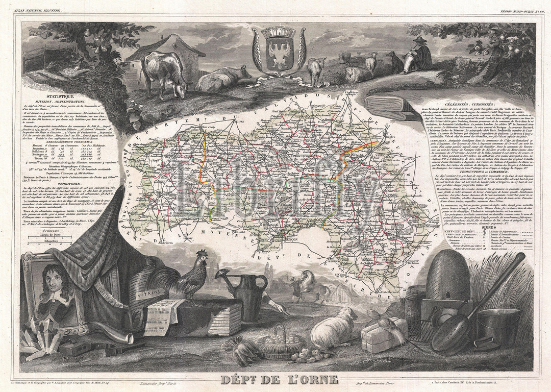 1852, Levasseur Map of the Department De L'Orne, France, Camembert Cheese Region, topography, cartography, geography, land, illustration, geographic, travel, topo, chart, grid, latitude, longitude, geometric, atlas, map, vintage, ancient, history, world, paper, old, retro, earth, atlas, art, historical, decorative, navigation, aged, historic, journey, discovery, exploration, geographical, Mappa mundi, space, region, old map, antique map, rare old maps, old antique plan, ols antique map, old antique view