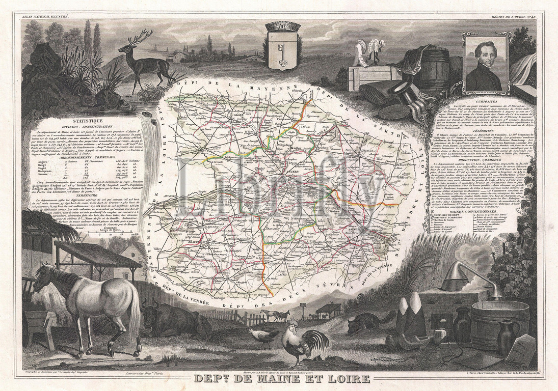1852, Levasseur Map of the Department De Maine et Loire, France