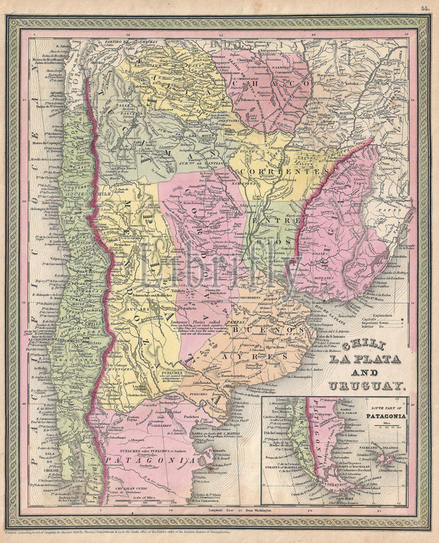 1853, Mitchell Map of Argentina, La Plata , Uruguay and Chili