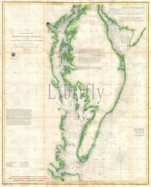 1855, U.S. Coast Survey Chart or Map of Chesapeake Bay and Delaware Bay