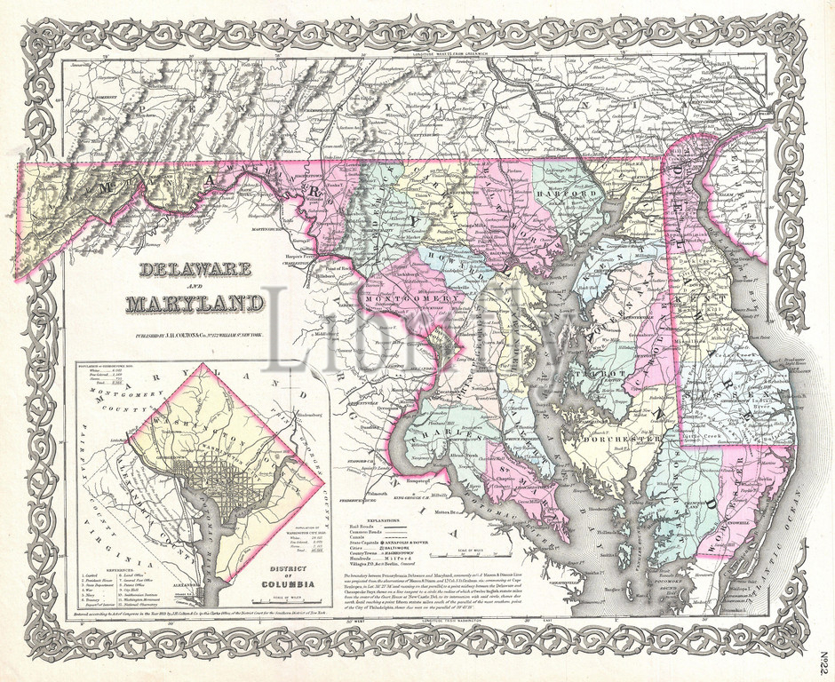 1855, Colton Map of Delaware, Maryland, and Washington D.C., topography, cartography, geography, land, illustration, geographic, travel, topo, chart, grid, latitude, longitude, geometric, atlas, map, vintage, ancient, history, world, paper, old, retro, earth, atlas, art, historical, decorative, navigation, aged, historic, journey, discovery, exploration, geographical, Mappa mundi, space, region, old map, antique map, rare old maps, old antique plan, ols antique map, old antique view