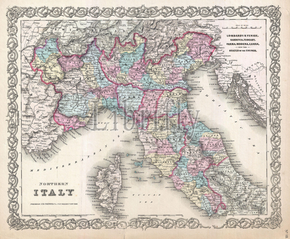 1855, Colton's Map of Northern Italy and Corsica
