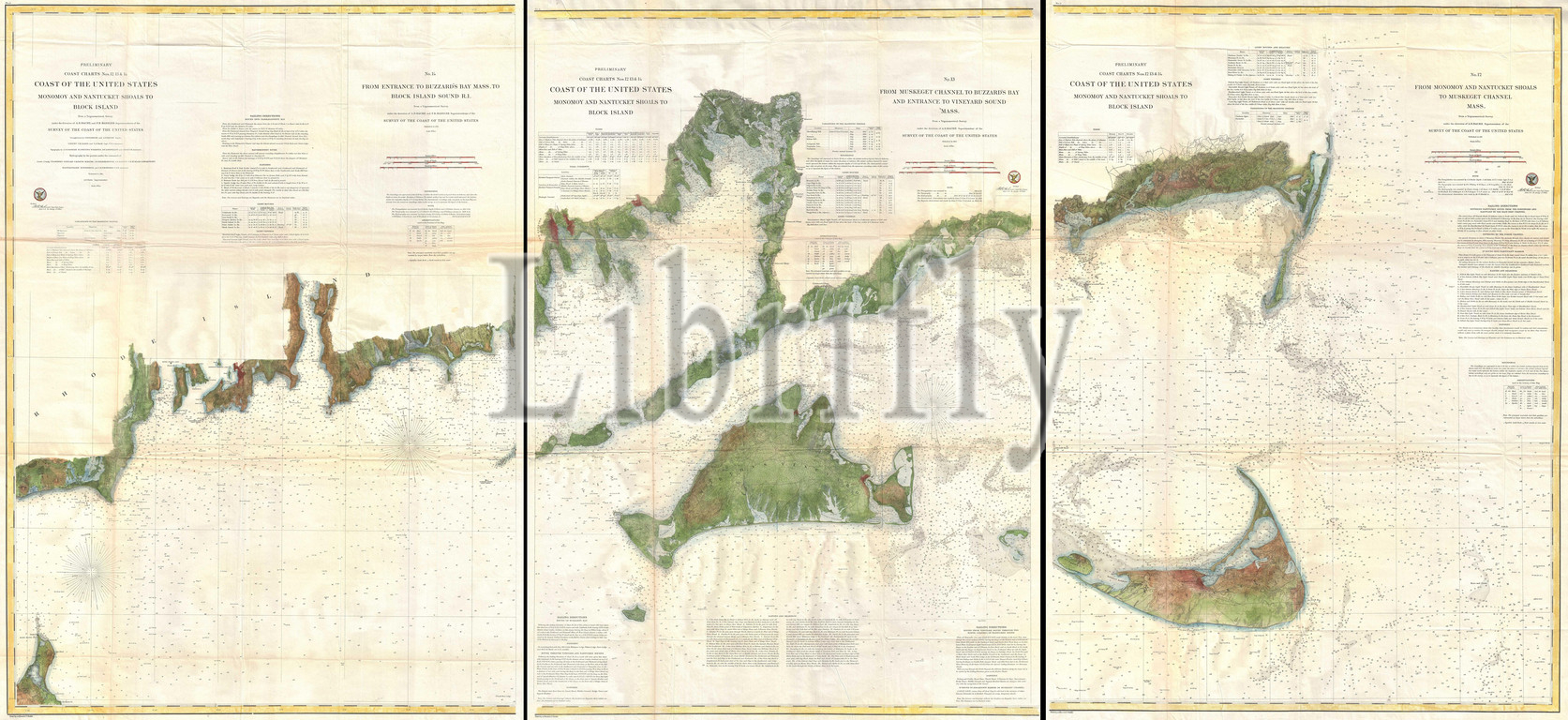 1860, U.S. Coast Survey Map of Block Island, Buzzard Bay, Nantucket and Marthas Vineyard
