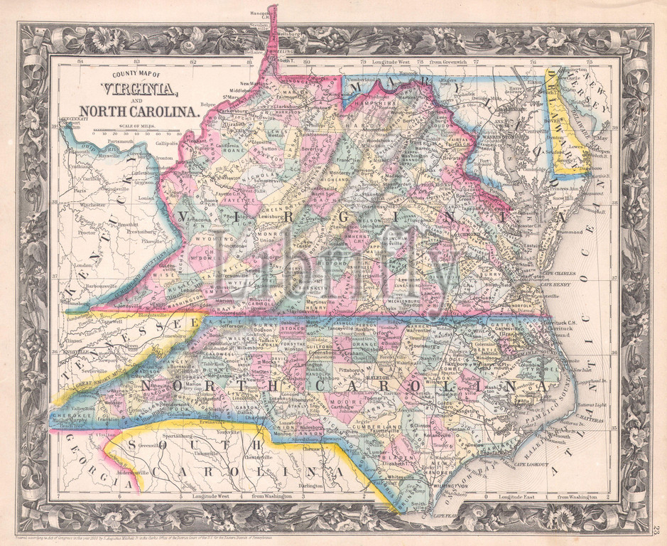 1860, Mitchell Map of Virginia, undivided and North Carolina