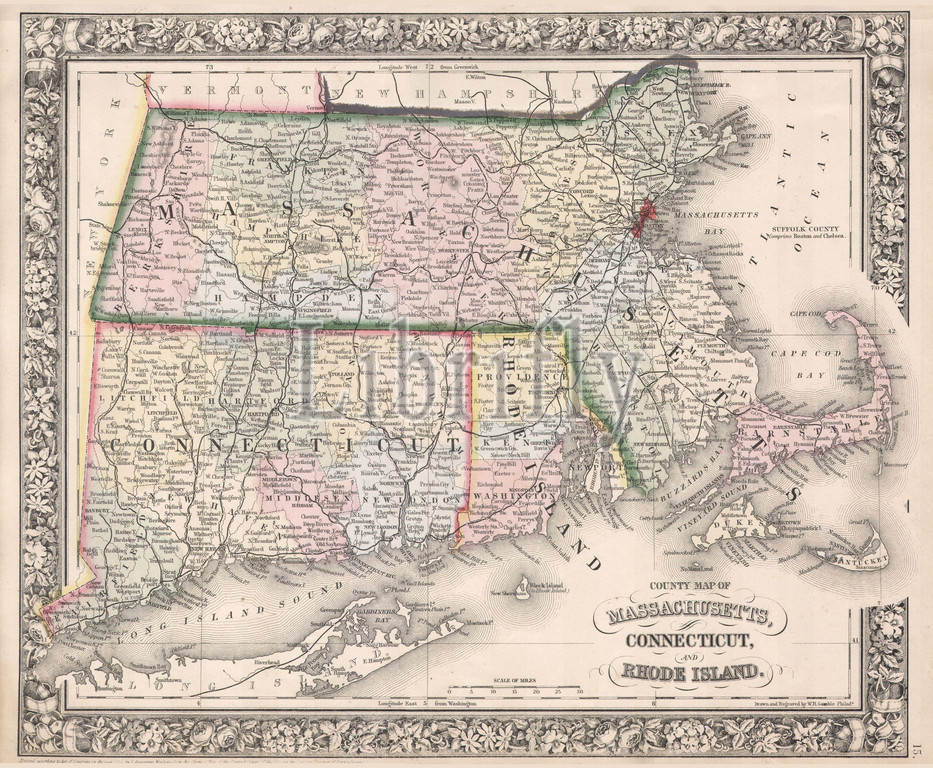 1864, Mitchell Map of Massachusetts, Connecticut and Rhode Island