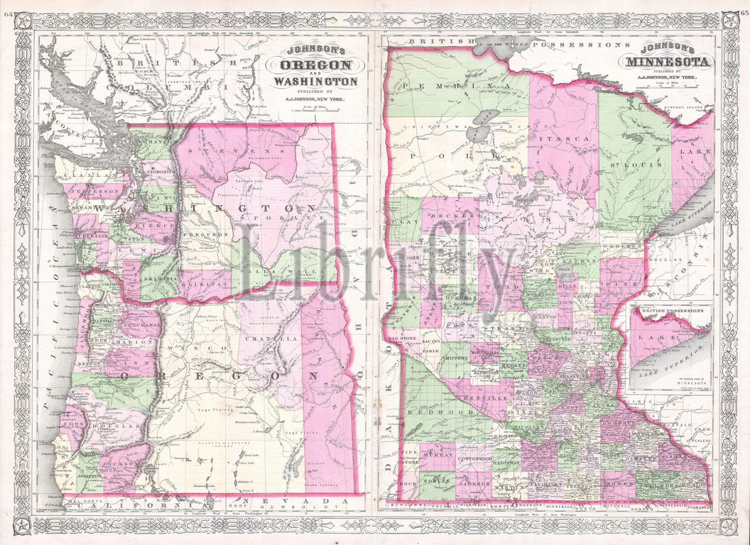 1865, Johnson Map of Washington, Oregon and Minnesota