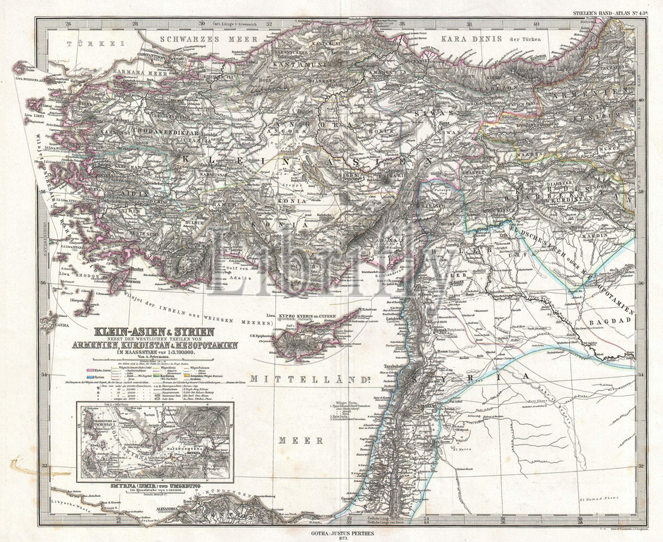 1873, Stieler Map of Asia Minor, Syria and Israel, Palestine, modern Turkey