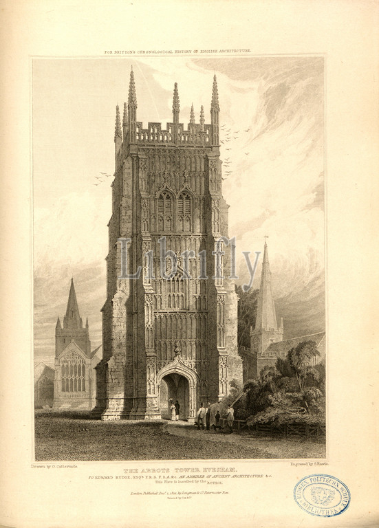 The Abbots Tower Evesham, Evesham Abbey Bell Tower in Evesham, Worcestershire, signed: Drawn by G. Cattermole; Engraved by S. Rawle; Published by Longman & Co, Fig. 69, p. 260, Cattermole, George (drawing); Rawle, Samuel (engraving); Longman & Co. (published), 1822, John Britton: The architectural antiquities of Great Britain: represented and illustrated in a series of views, elevations, plans, sections and details of various ancient English edifices: with historical and descriptive accounts of each. Bd. 5. London: J. Taylor, 1807-1826