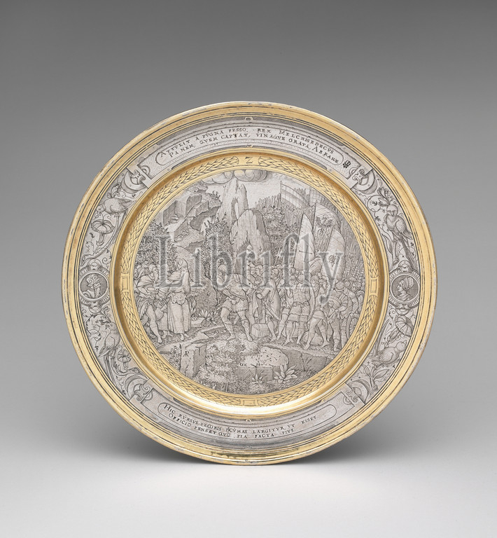 Abraham Refreshed, Melchisedek, ca, 1567, British, Silver, parcel gilt, Overall, confirmed, 5/8 x 7 3/4, 8 oz, 11 dwt, 1.6 19.7 cm, 0.266kg, Metalwork-Silver, fine, engraving, set, plates depicts, scenes, Old Testament, engraver, must, trained, Continent, based, compositions, illustrations, Concordance, Bible, improvising, necessary, fill, circular frame, offered, plates