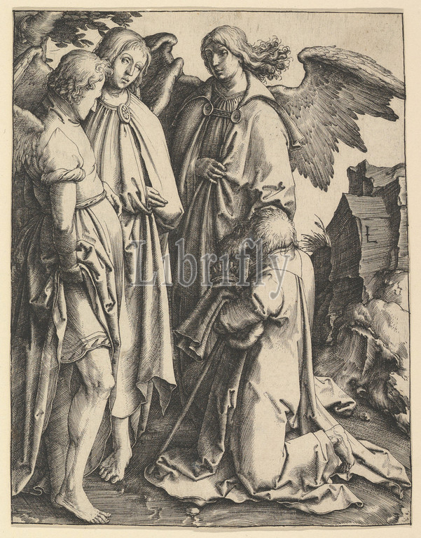 Abraham and Three Angels, ca. 1513, Engraving, sheet: 6 15/16 x 5 7/16 in. (17.6 x 13.8 cm), Prints, Lucas van Leyden (Netherlandish, Leiden ca. 1494–1533 Leiden)