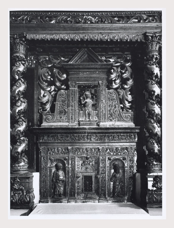 Abruzzo Teramo Tossicia S. Maria Assunta, this is my Italy, the italian country of visual history, External views of church and facade with its carved human heads, although in most part rather rustic. Photos of late Renaissance interior 1570 with its curved moldings and ornamentation in the time between the Renaissance and Baroque. It is not as ornate as later Baroque interiors. There are details of a painting of the Assumption, the pulpit and the ornate high altar of wood decorated with gold