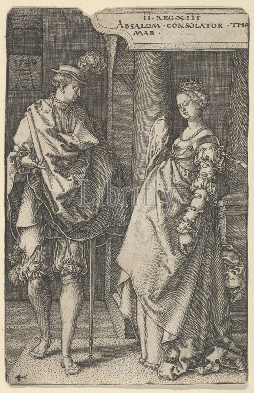 Absalom Comforting Tamar, 1540, Engraving; second state of two (New Hollstein), Sheet: 4 11/16 × 3 1/16 in. (11.9 × 7.7 cm), Prints, Heinrich Aldegrever (German, Paderborn ca. 1502–1555/1561 Soest), Absalom, in a feathered hat at left, comforts Tamar, who stands facing him at right. Based on 2 Samuel 13:20. Plate 4 from a series of seven plates with the Story of Amnon and Tamar.