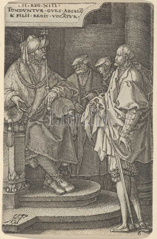 Absalom Inviting David, Brothers, 1540, Engraving, second state, two, New Hollstein, Sheet, 4 11/16, 3 1/16, 11.9, 7.7 cm, Prints, Heinrich Aldegrever, German, Paderborn ca., 1502–1555/1561, Soest, standing, sword, right addresses, David, seated, throne, holding, scepter, left, Two figures, visible, background, center, Based, 2 Samuel, 13, 24-27, Plate 5, series, seven plates, Story, Amnon, Tamar