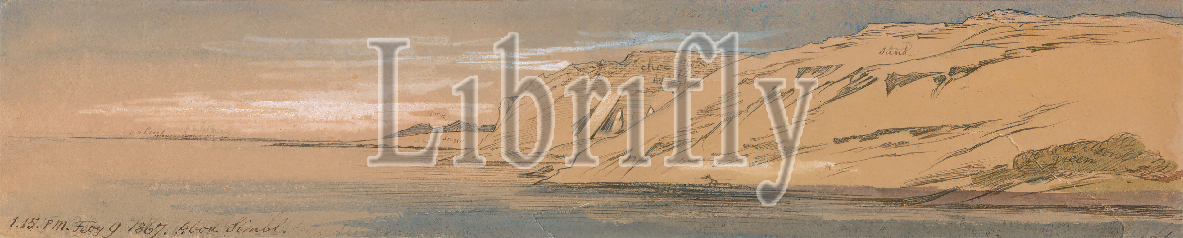 Abu Simbel, Edward Lear, 1812–1888, British, 1867, Watercolor, graphite, white gouache, pen and brown ink on moderately thick, slightly textured, beige wove paper, Sheet: 2 5/16 x 10 5/8 inches (5.9 x 27 cm), cliffs, lake, landscape, river, riverbank, sky, water, Abu Simbel, Africa, Egypt, Lake Nasser, Nubia