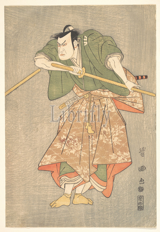 Actor Kataoka Nizaemon, Ceremonial Robes, Green, Pink, Drawing, Sword, Edo period, 1615–1868, 1769–1825, Japan, Polychrome woodblock print, ink, color, paper, 14 11/16 x 10, 37.3 25.4 cm, Prints, Utagawa Toyokuni I, Japanese