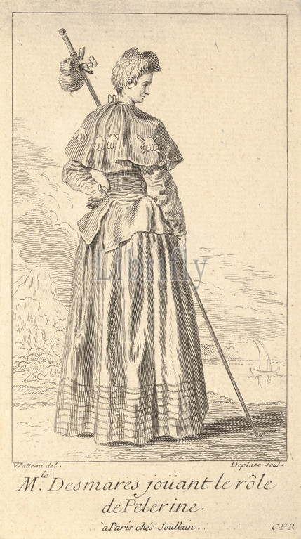Actress Charlotte Desmares playing, role, pilgrim, shown, head turned, right, holds, walking stick, scallop shells adorn, cape, ca, 1710–39, Etching, engraving, sheet, 5 1/2 x 3 1/16, 13.9 7.7 cm, Prints, Louis Desplaces, French, Paris, 1682–1739, After Antoine Watteau, Valenciennes, 1684–1721, Nogent-sur-Marne