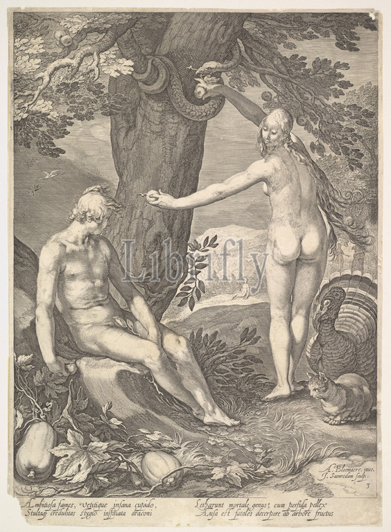 Adam and Eve, Engraving, sheet: 11 x 7 15/16 in. (27.9 x 20.1 cm), Prints, Jan (Pietersz.) Saenredam (Netherlandish, Zaandam ca. 1565–1607 Assendelft), After Abraham Bloemaert (Netherlandish, Gorinchem 1566–1651 Utrecht)
