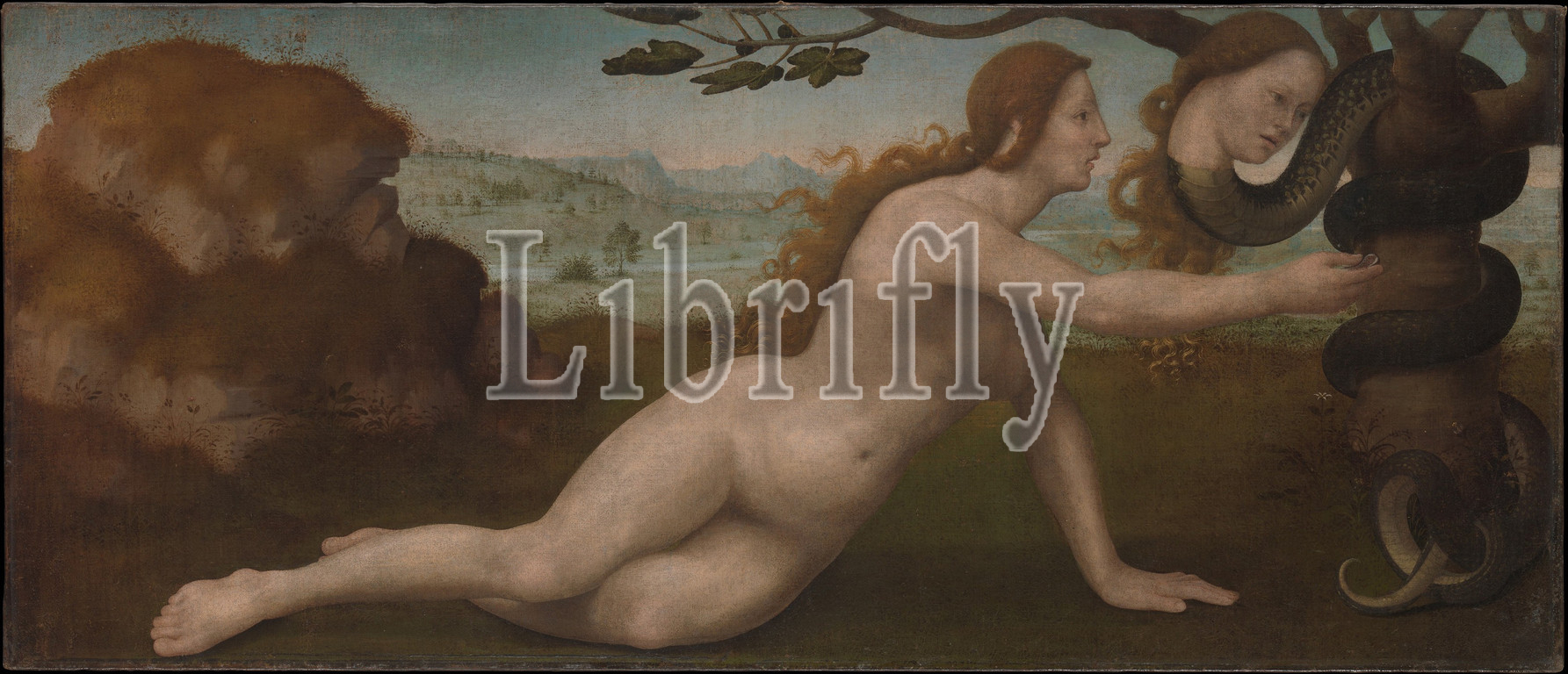 Adam; Eve, Oil on canvas, Each 26 3/8 x 61 3/4 in. (67 x 156.8 cm), Paintings, Giuliano di Piero di Simone Bugiardini (Italian, Florence 1475–1554 Florence), These two paintings depicting the biblical story of the temptation of Eve were probably made to be set within the wall paneling of a Florentine bedroom around 1520. Bugiardini painted several comparable oblong nude figures for similar settings but more typically the figures are taken from classical history or myth