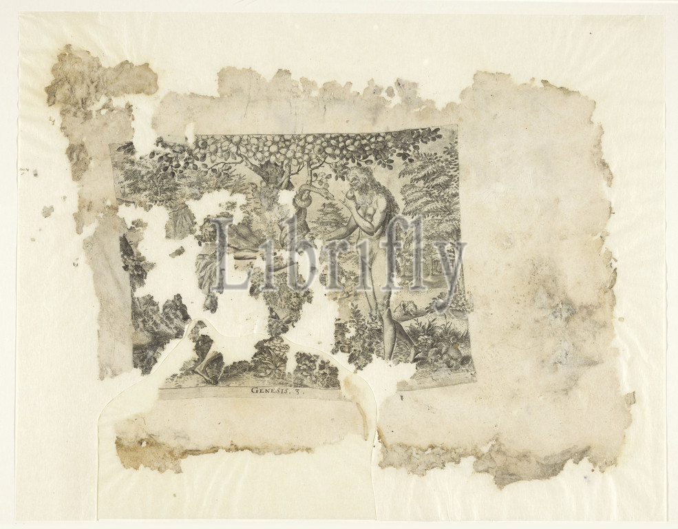 Adam, Eve, Eve represent, tree, knowledge, paradise, Eve offers Adam, apple, brings, second apple, mouth, ground, background various animals, bottom margin, text Genesis 3, Reconstructed, two fragments, Eve offers, fruit, Southern Netherlands, 1570, 1590, paper, engraving