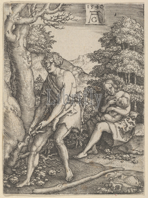 Adam and Eve at Work, from The Story of Adam and Eve, 1540, Engraving, Sheet: 3 7/16 × 2 1/2 in. (8.7 × 6.4 cm), Prints, Heinrich Aldegrever (German, Paderborn ca. 1502–1555/1561 Soest), Adam, in the foreground at left, pulls up roots, while Eve nurses a child at right. Both are clothed and set in a landscape. Based on Genesis 3:17-19. Plate 6 from a series of six engravings.