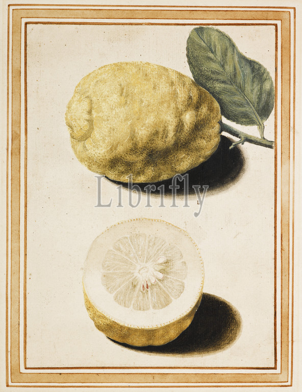 Adam's Apple, Pomum Adami Rheginum, Vincenzo Leonardi, Italian, 1640, watercolor, pencil, off-white laid paper laid down, mount, 11 x 8, sheet, 15 x 12-1/4, Annotation, whole fruit, proper left, center, L Engraved, J.B. Ferrari, Hesperides sive de Malorum Aureorum Cultura et Usu Libri, Quattuor, Rome, 1646, p. 311. Literature, D. Freedberg, E. Baldini, Paper Museum, Cassiano Dal Pozzo, Series B, Natural History, Part, Citrus Fruit, London, 1997, pp. 193-195, no. 58