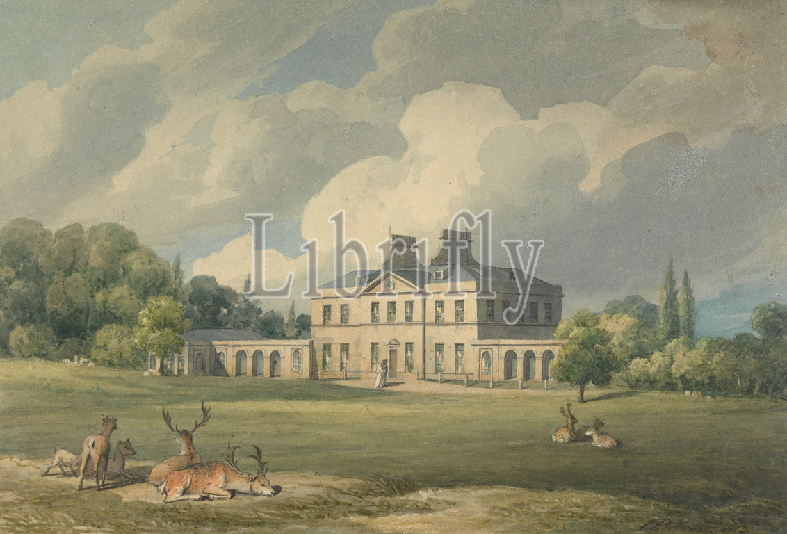Addington Place, Surrey, John Preston Neale, 1771, 80–1847, British, 1813, Watercolor, graphite, medium, slightly textured, cream wove paper, Sheet, architectural subject, chimneys, clouds, country house, deer, grounds, landscape, park, grounds, stags, trees, Croydon, England, Europe, Surrey, United Kingdom