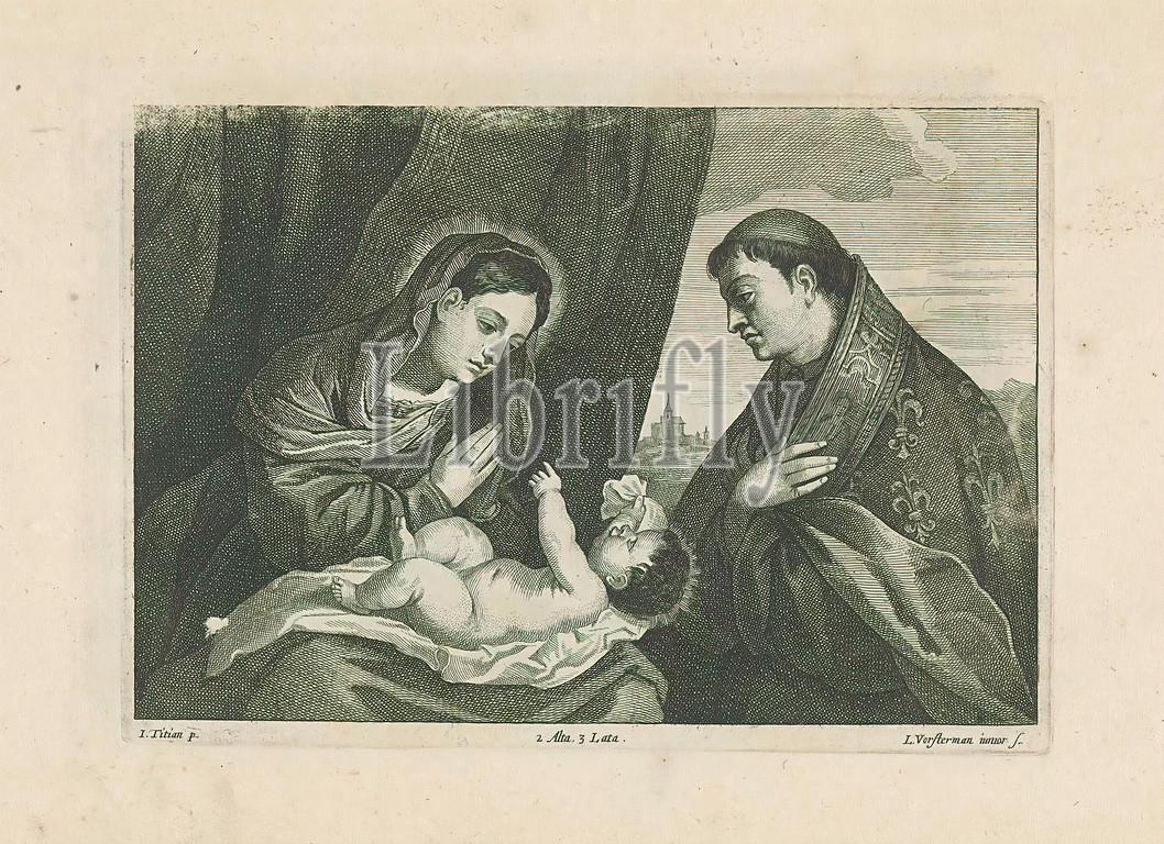 Adoration, Christ, Mary, St. Louis, Toulouse, Christ Child, Drapery, Saint Louis, wearing, bishop's robe, background buildings, landscape, print, part, album, Mary kneeling, ground, Christ-child lying, front, Louis, Anjou, son, king, Naples, Franciscan friar, bishop, possible attributes, fleur-de-lis, cope, crown, scepter, Lucas Vorsterman, II, mentioned, object, 1660, paper, engraving