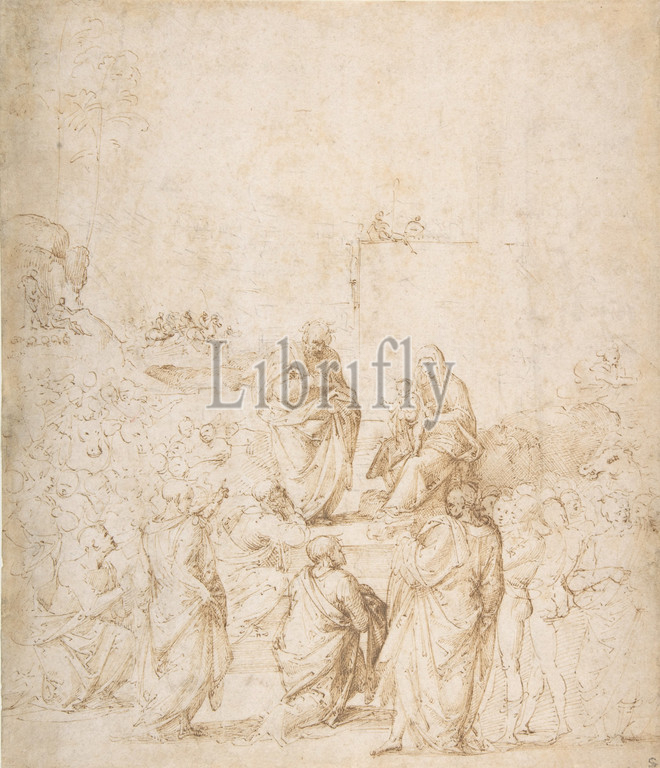 Adoration, Magi, ca, 1500, Pen, brown ink, traces, black chalk, 10-15/16 x 9-7/16, 27.8 24.0 cm, Drawings, Fra Bartolomeo, Bartolomeo di Paolo del Fattorino, Italian, Florence, 1473–1517, early drawing, artist, Holy Family, raised platform, seated Virgin holds, blessing Christ, Child, knee, pensive Saint, Joseph, stands, left, grouped, foot, steps leading, platform