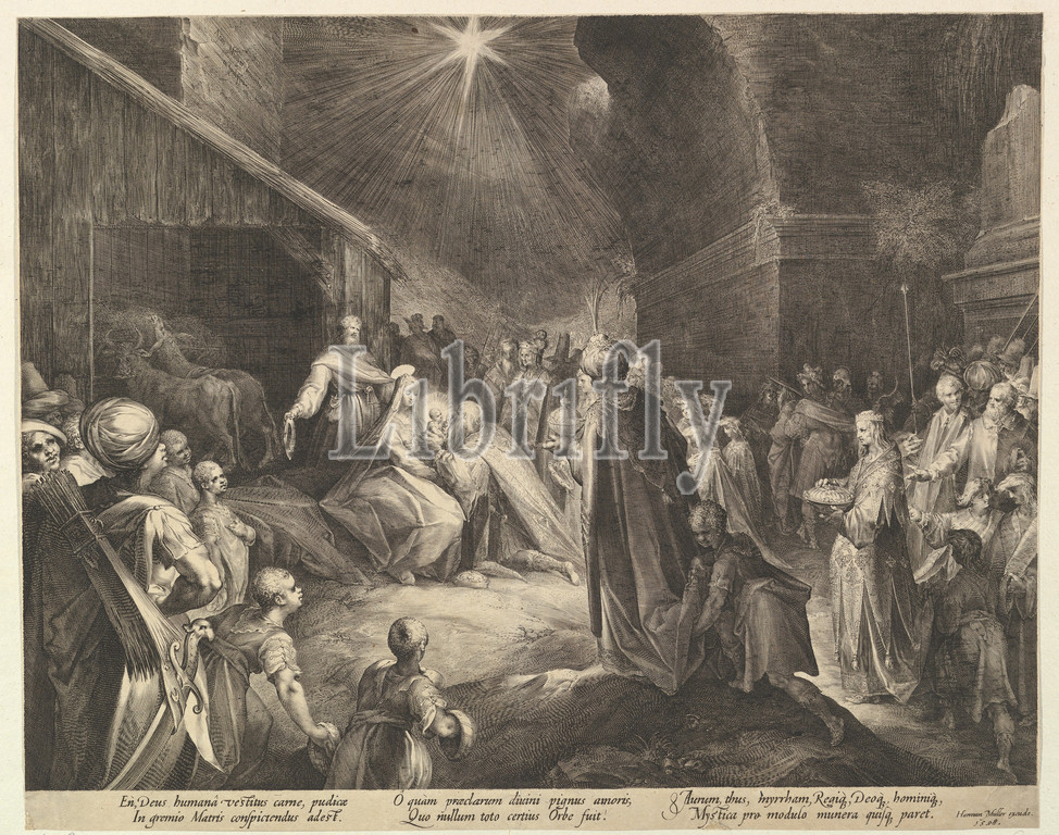 Adoration, Magi, ca, 1625, Engraving, fourth state, four, 13 9/16, 17 3/16, 34.5, 43.6 cm, Prints, Jan Muller, Netherlandish, Amsterdam, 1571–1628