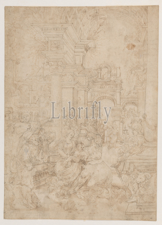 Adoration, Magi, first quarter 16th century, Flemish, Antwerp, Pen, light brown, grayish brown ink, traces, black chalk, original borderline, 11 x 7 15/16, 28 20.2 cm, Drawings, of the sixteenth, drawing, elegant figures, worshipping, Virgin, Child set, amidst, ruins, antiquity, attributed, Lucas van, Leyden, 1489, 94-1533, hence, L added, later, architectural base, lower right