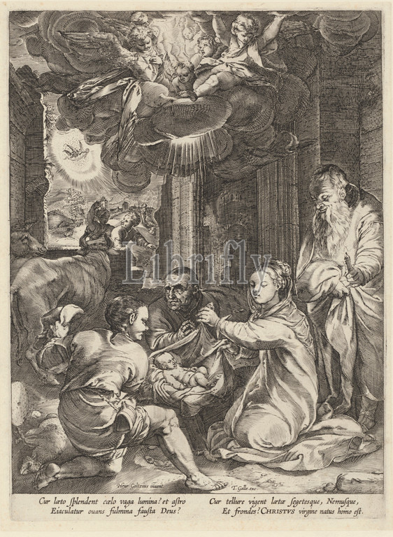 adoration, shepherds, Mary, Joseph, seated, ruin, newborn child, two shepherds, background, proclamation, angel, four Latin verses, Adoration, Christ-child, Joseph present, Hendrick Goltzius, mentioned, object, c, 1594, 1633, paper, engraving