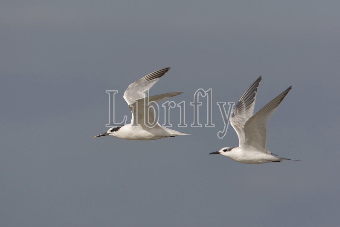 Adult and immature Sandwich Tern in flight, Thalasseus sandvicensis, Netherlands